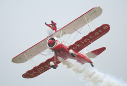 No #6 Stearman, which became a subsidiary of Boeing in 1934, began building its Model 75 biplane basic trainer in the early 1930s. The U.S. Army Air Force adopted the rugged and reliable aircraft as a primary trainer, calling it the Kaydet, and the aircraft also became a basic trainer for the U.S. Navy. Nearly 8,600 were produced in the 1930s and 1940s for military use and after World War II large numbers of war-surplus Stearmans were bought to be used as crop dusters and sport aircraft. Many flew at air shows and one is shown here performing a modern-day display with a wing-walker harnessed to the top of its upper wing.